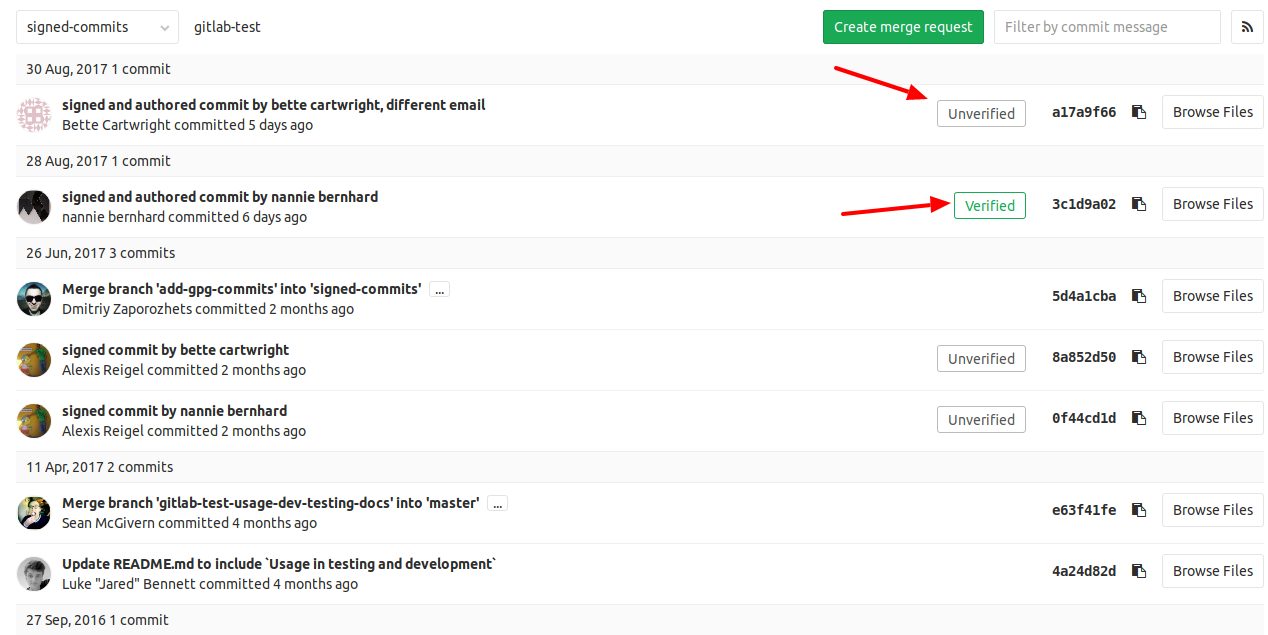 Within a project or merge request, navigate to the Commits tab. Signed commits will show a badge containing either "Verified" or "Unverified", depending on the verification status of the GPG signature.